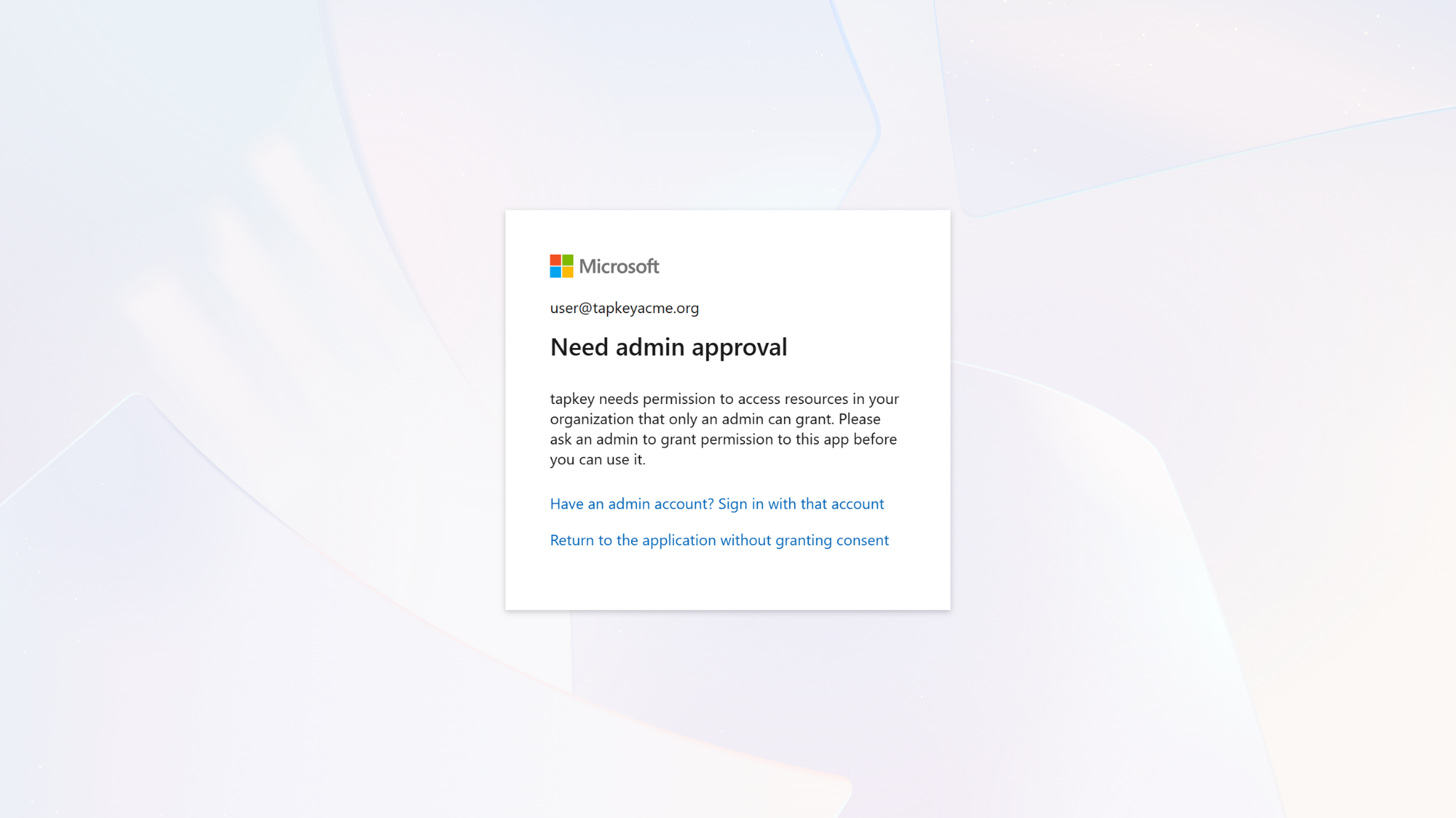 Important: If you see an admin approval request, the account you are using does not have the required privileges to connect with the Tapkey Add-On in your Entra ID tenant. More information can be found here.