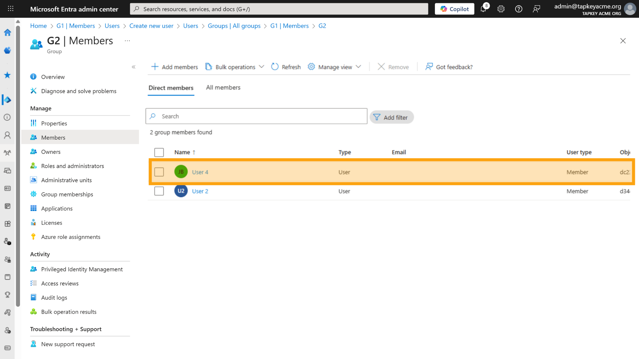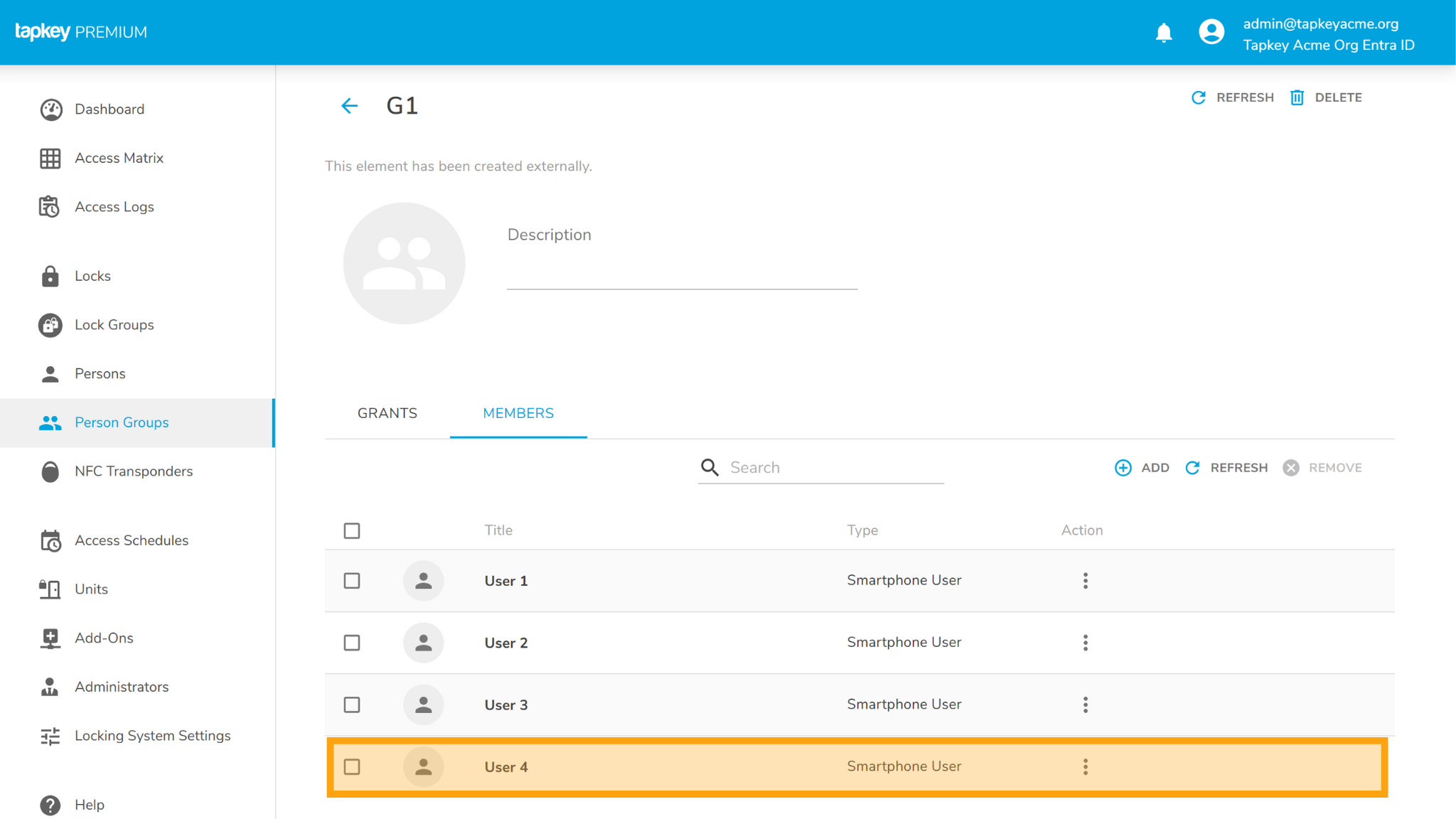 In the following example, we are going to add User 4 into G2, in this case the user is going to be created in the Tapkey Person Group G2 and in addition, the user will be created as member of G1 given that G2 group is member of G1 in Entra ID.