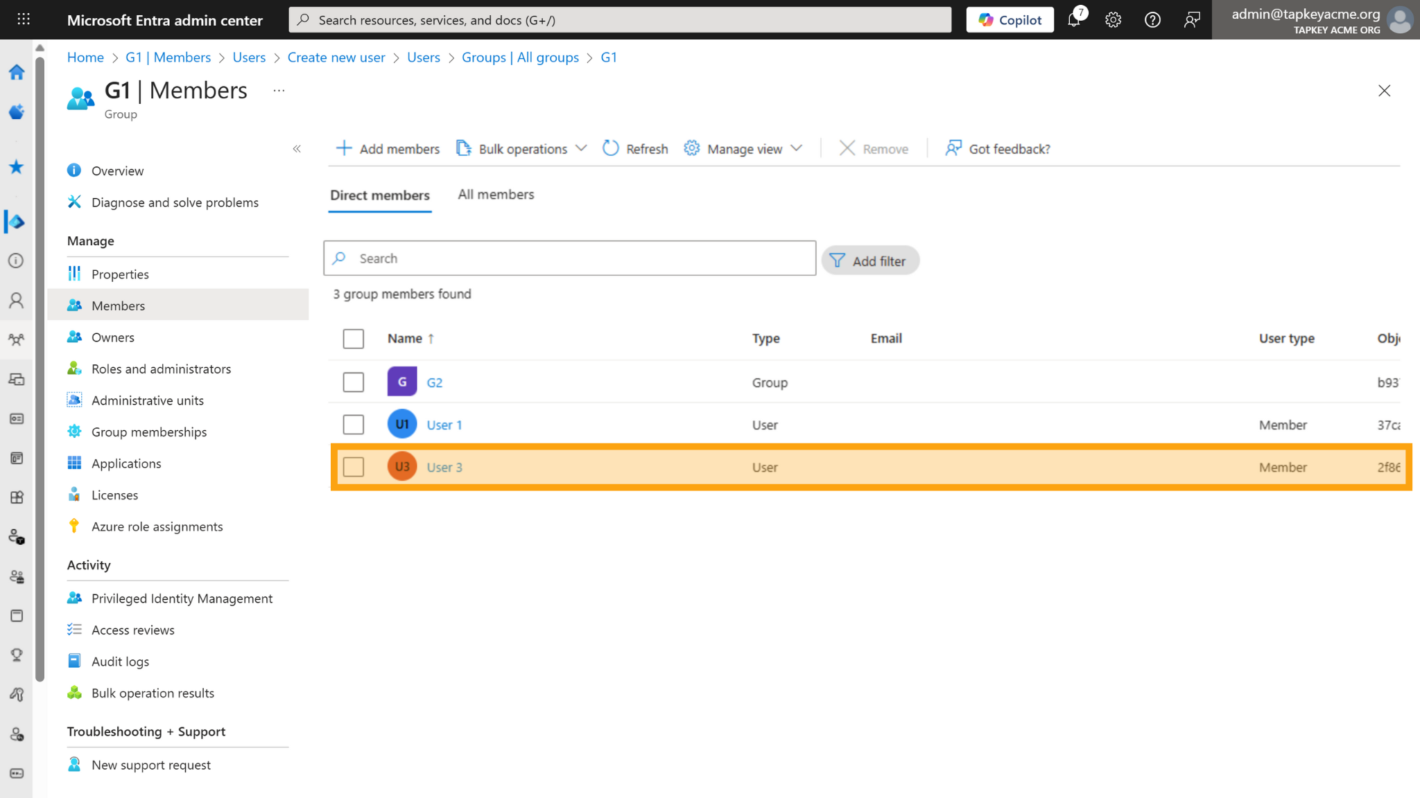 Adding User 3 into G1 will create the same user in G1 automatically: