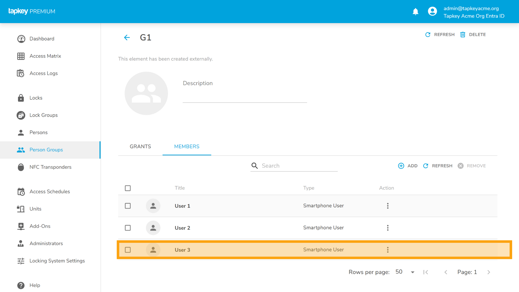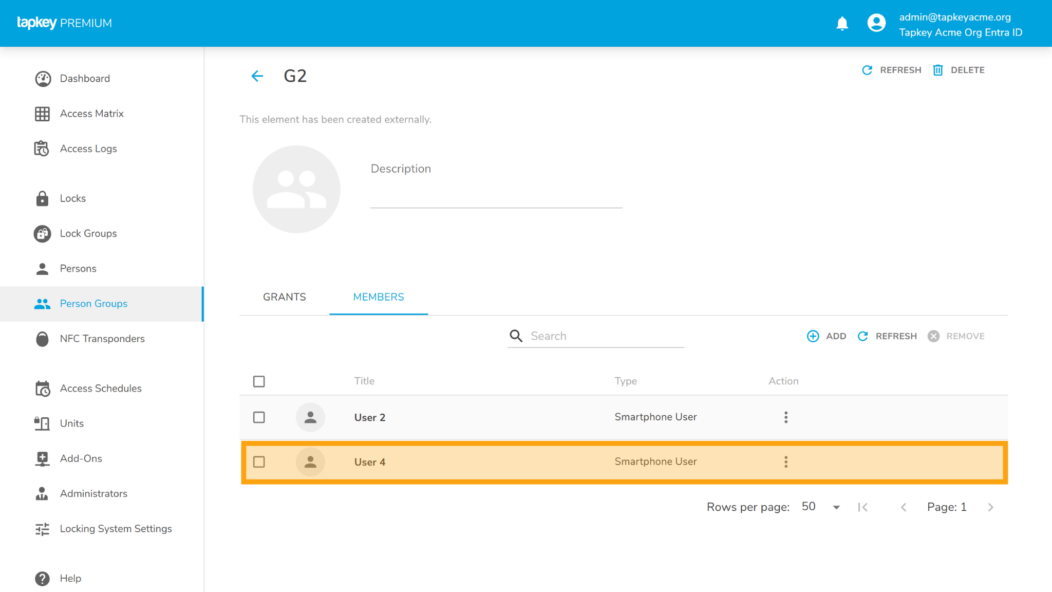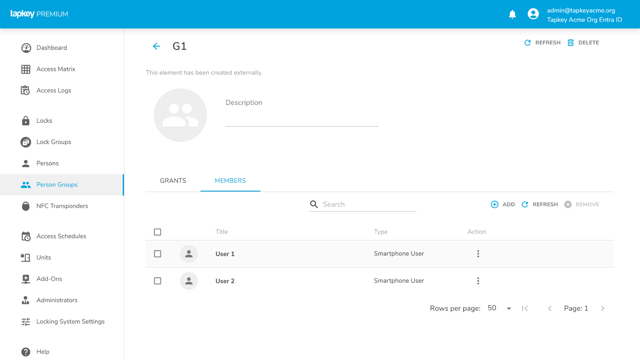 G1 has some data pre-created in the Tapkey Acme Org’s Entra ID, as soon as you click save you can navigate to the “Person Groups” and see the details of the group created.