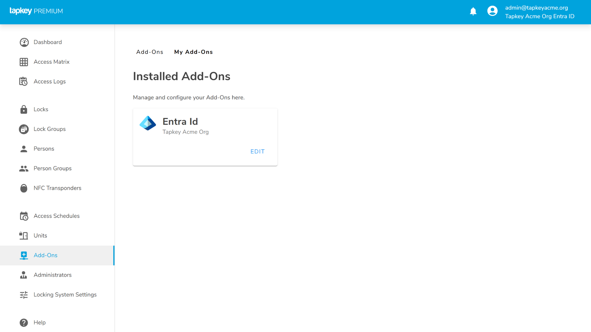 • An Entra ID tenant, and an Administrator account is required to install the Entra ID Add-On in Tapkey.
