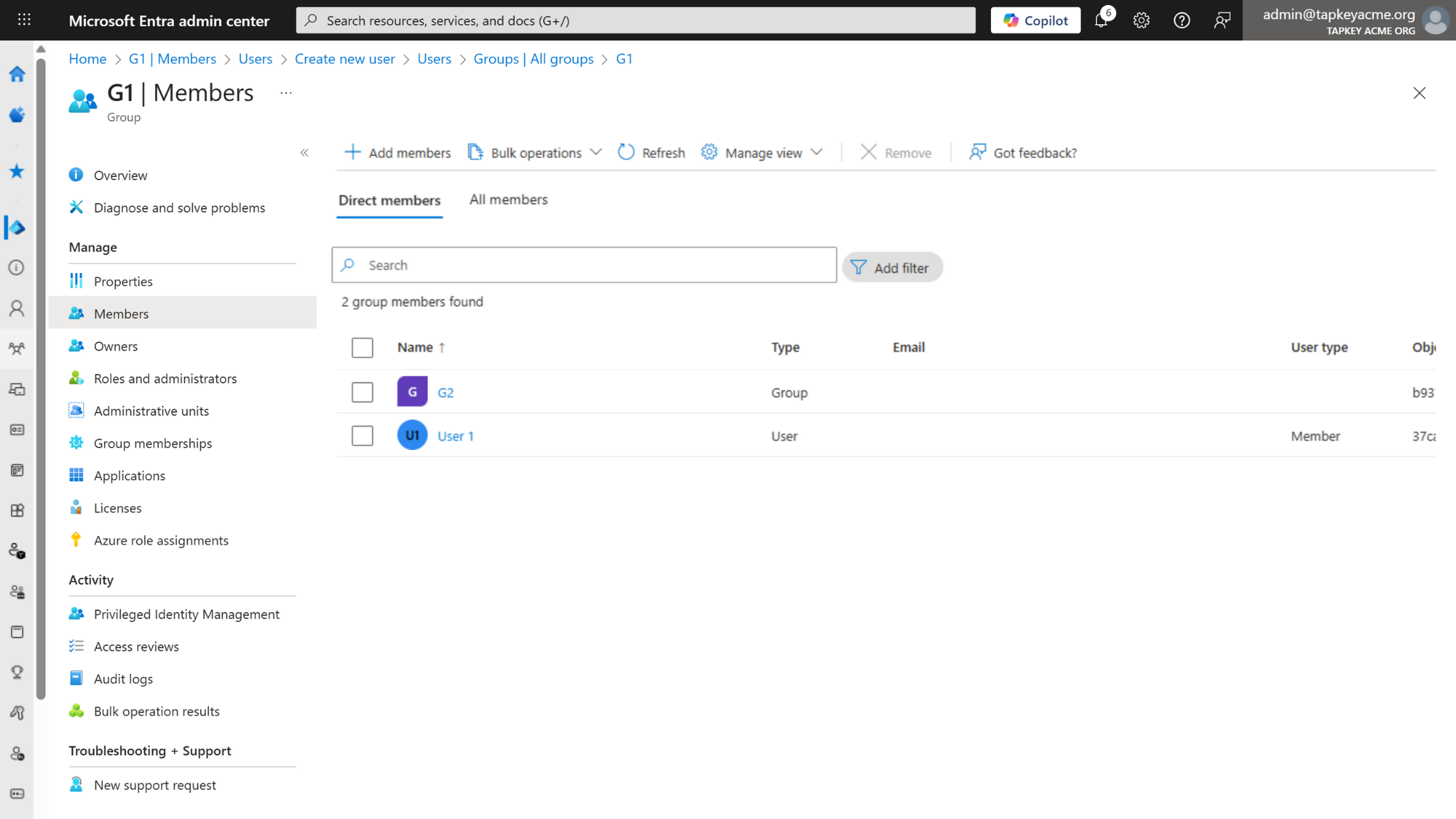 • User 1 (a direct member of G1) will be created as a member of G1 in Tapkey.